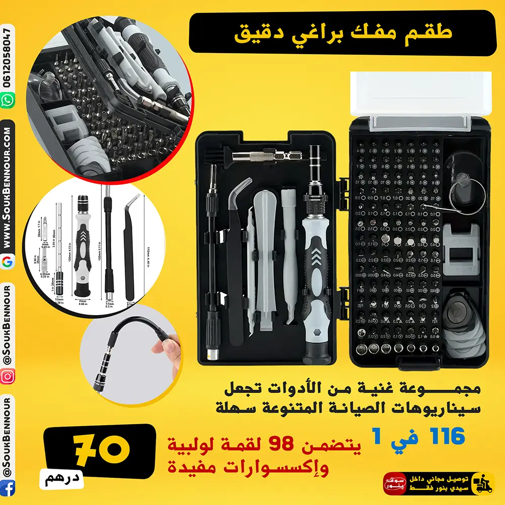 مجموعة مفكات 115 في 1 هي الحل الأمثل لجميع أعمال الصيانة والإصلاح في المنزل أو المكتب. تأتي هذه المجموعة الكاملة مع 98 قطعة مختلفة لتناسب جميع أنواع البراغي والمسامير، مع أدوات إضافية للفتح والتعديل، لتضمن لك أداءً احترافيًا وسهولة في الاستخدام.