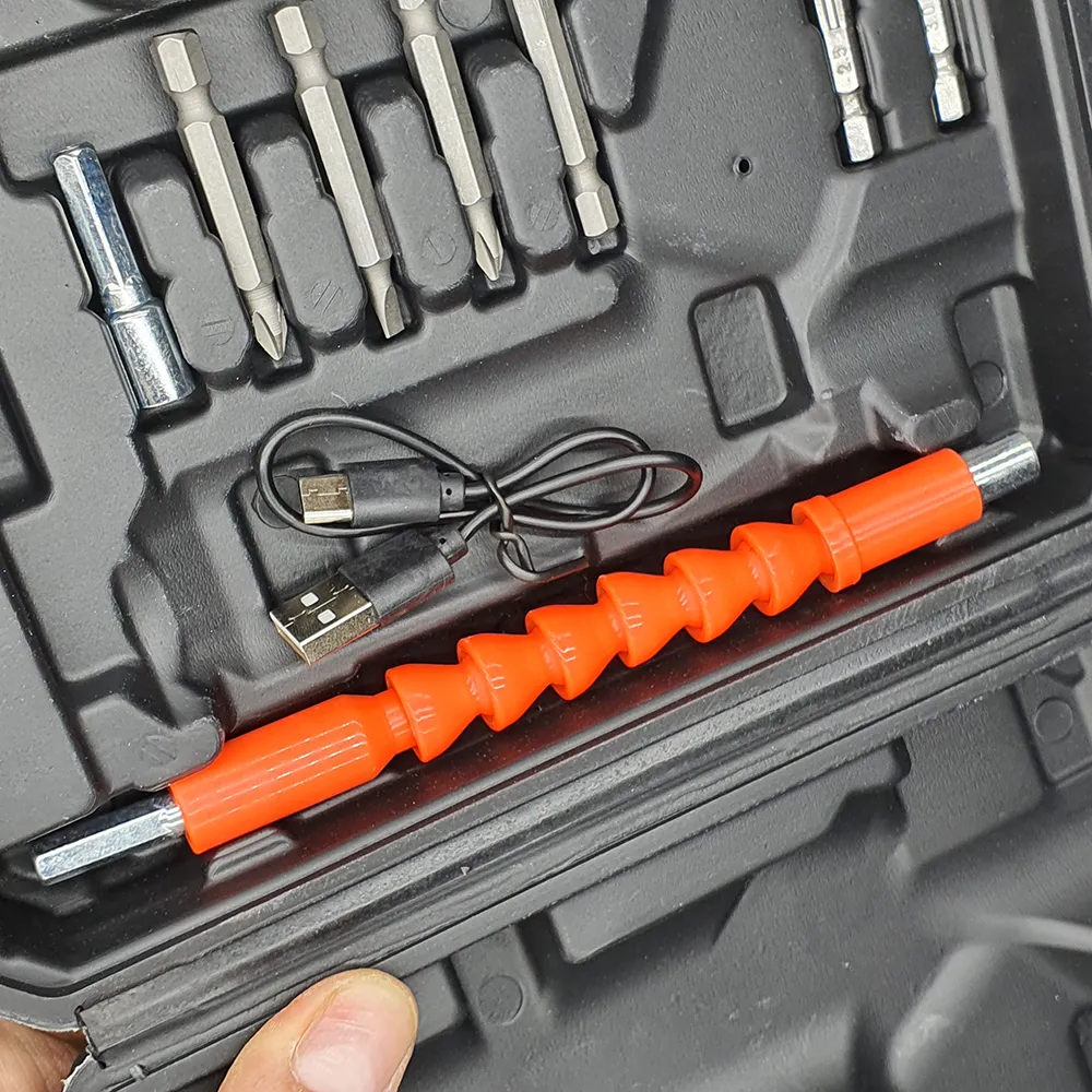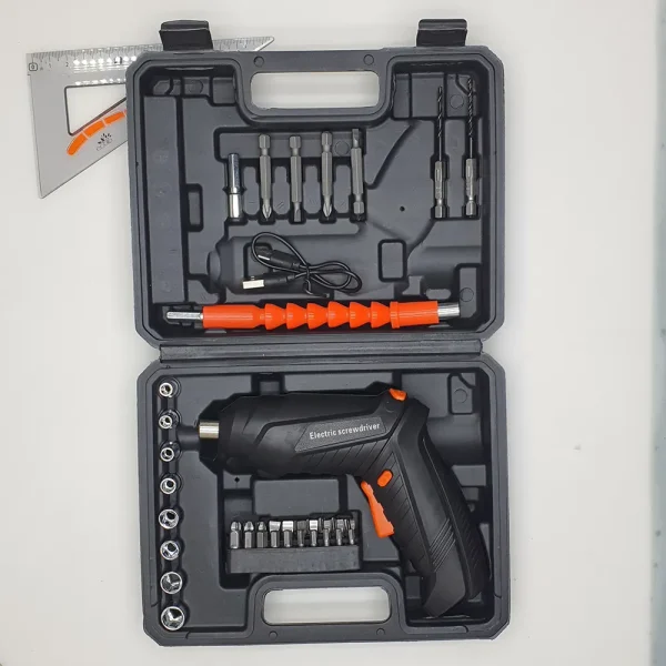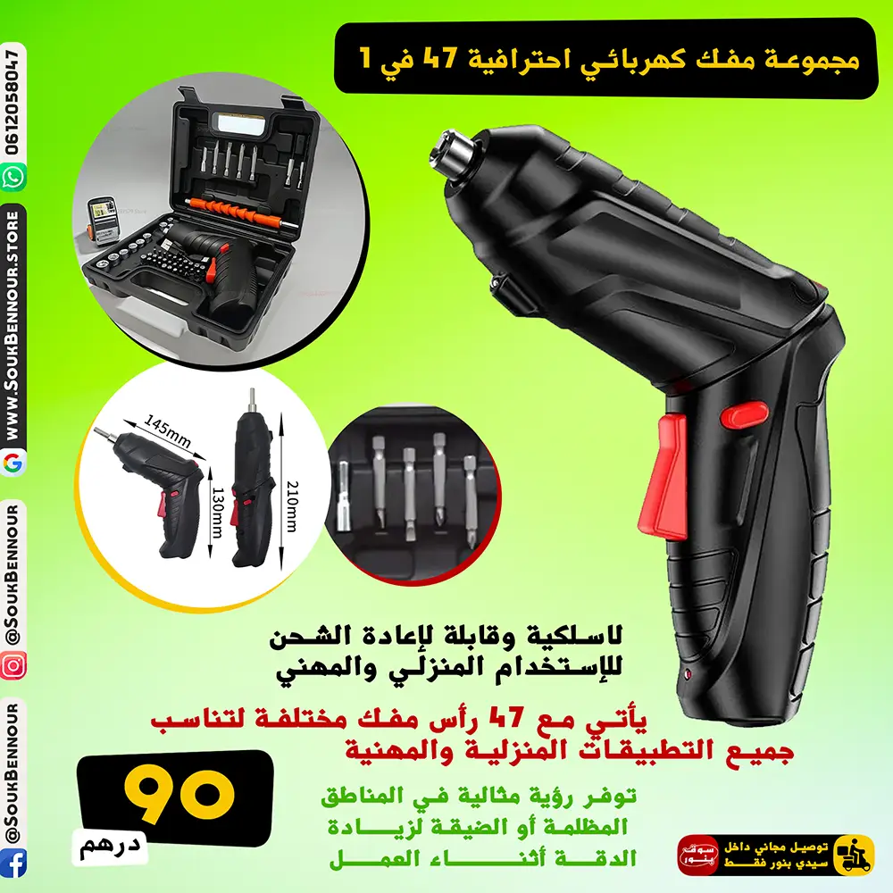 استمتع بالعمل بسهولة واحترافية مع المفك الكهربائي الذكي 47 في 1! يتميز بإمكانية الدوران بزاوية 90 درجة ليصل إلى الأماكن الضيقة بكل سهولة، مما يجعله الأداة المثالية لكل احتياجاتك في التركيب والإصلاح داخل المنزل أو المكتب.