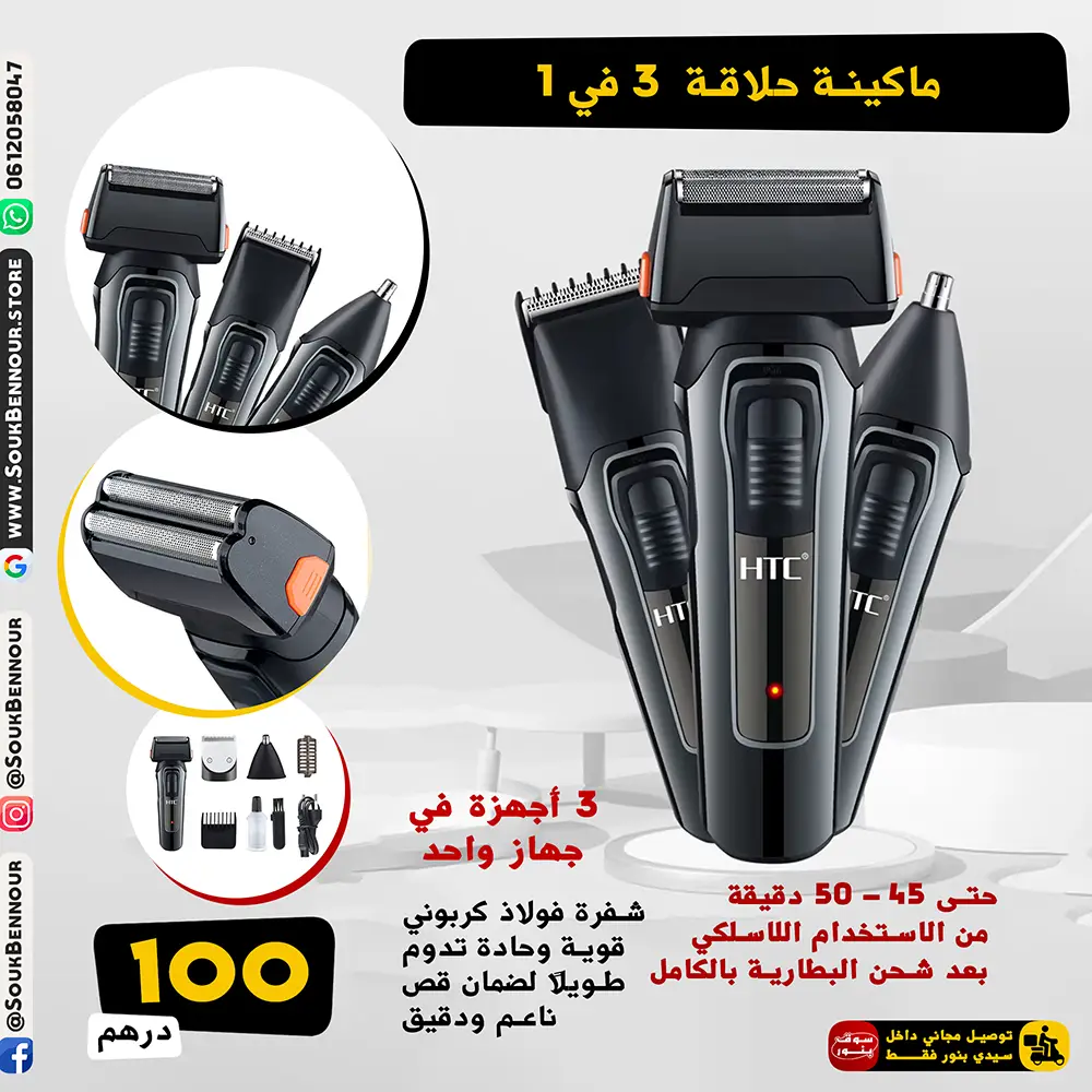 ماكينة حلاقة متعددة الوظائف 3 في 1 HTC AT-1088 – شحن USB • شفرة كربونية • تشغيل لاسلكي