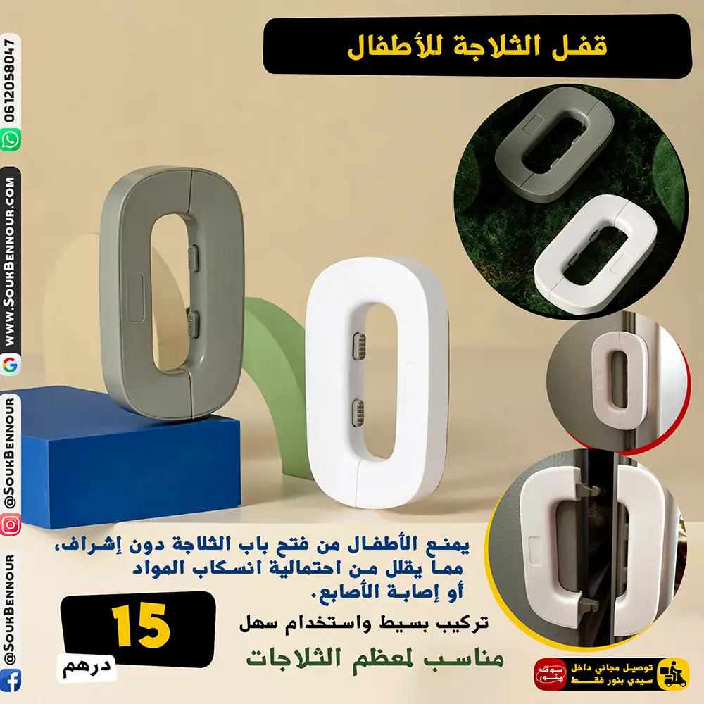 قفل أمان عملي مصمّم خصيصًا لمنع الأطفال من فتح الثلاجة بسهولة. يساعد هذا القفل في حماية الصغار من إصابة أصابعهم أو سحب الأشياء بطريقة قد تشكّل خطرًا عليهم. سهل التركيب والاستخدام، ويُغلق تلقائيًا مع إغلاق باب الثلاجة.