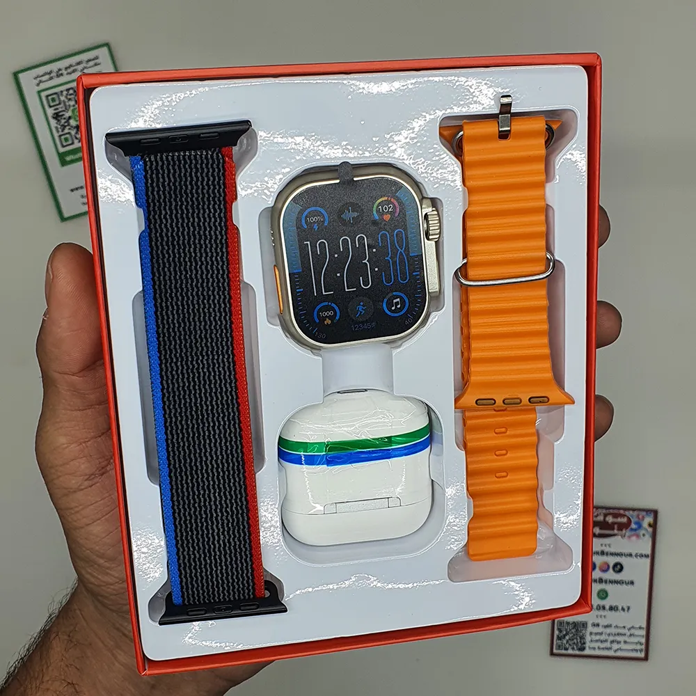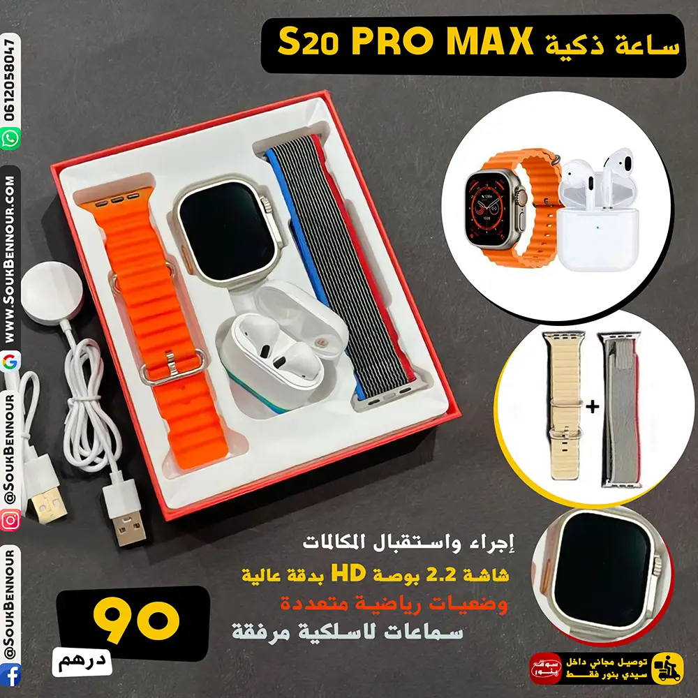 باك متكامل يجمع بين الساعة الذكية S20 PRO MAX عالية الأداء وسماعات لاسلكية بجودة ممتازة. تصميم أنيق، شاشة كبيرة واضحة، ومجموعة واسعة من الوظائف الصحية والرياضية، مع إمكانية إجراء واستقبال المكالمات بوضوح بفضل ميكروفون عالي التصفية.