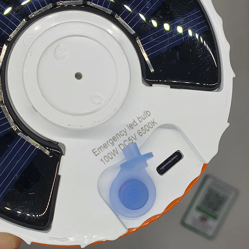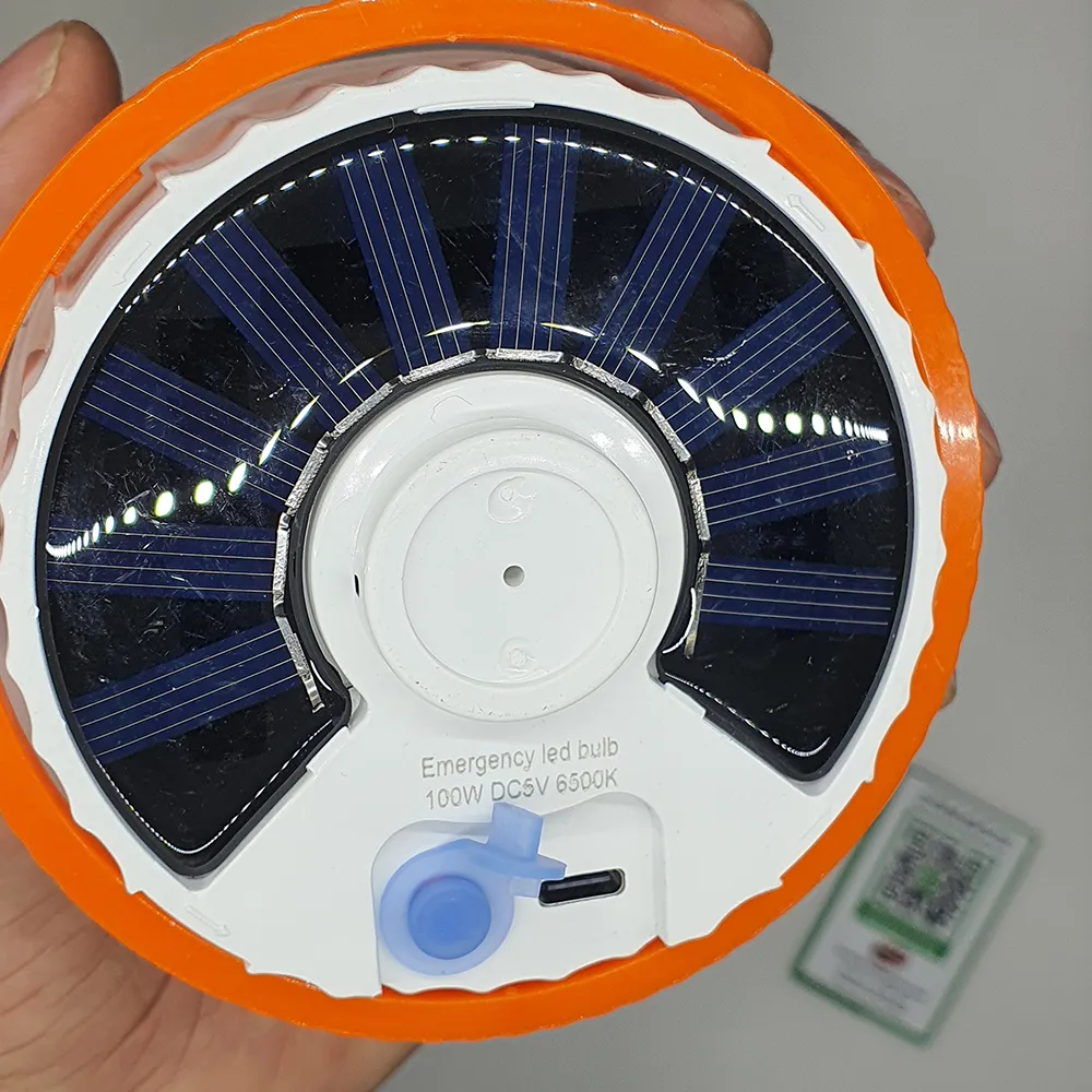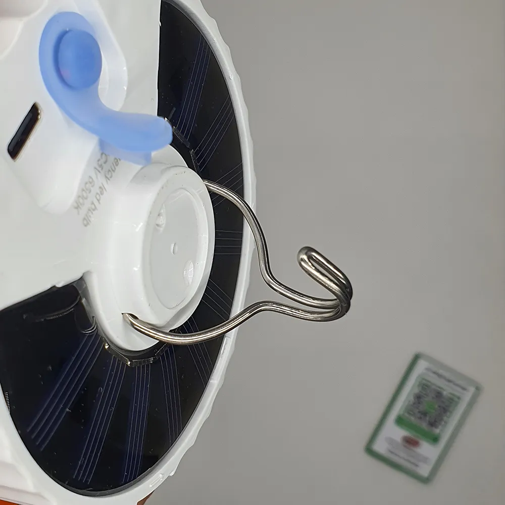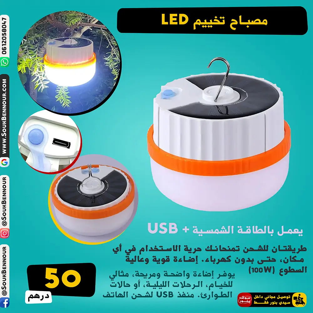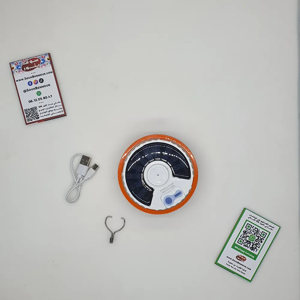 مصباح تخييم ذكي وقوي يعمل بالطاقة الشمسية أو الشحن عبر USB، مثالي للرحلات، التخييم، الطوارئ، والصيد، مع تصميم عملي يمكن تعليقه بسهولة داخل الخيمة أو في أي مكان خارجي.