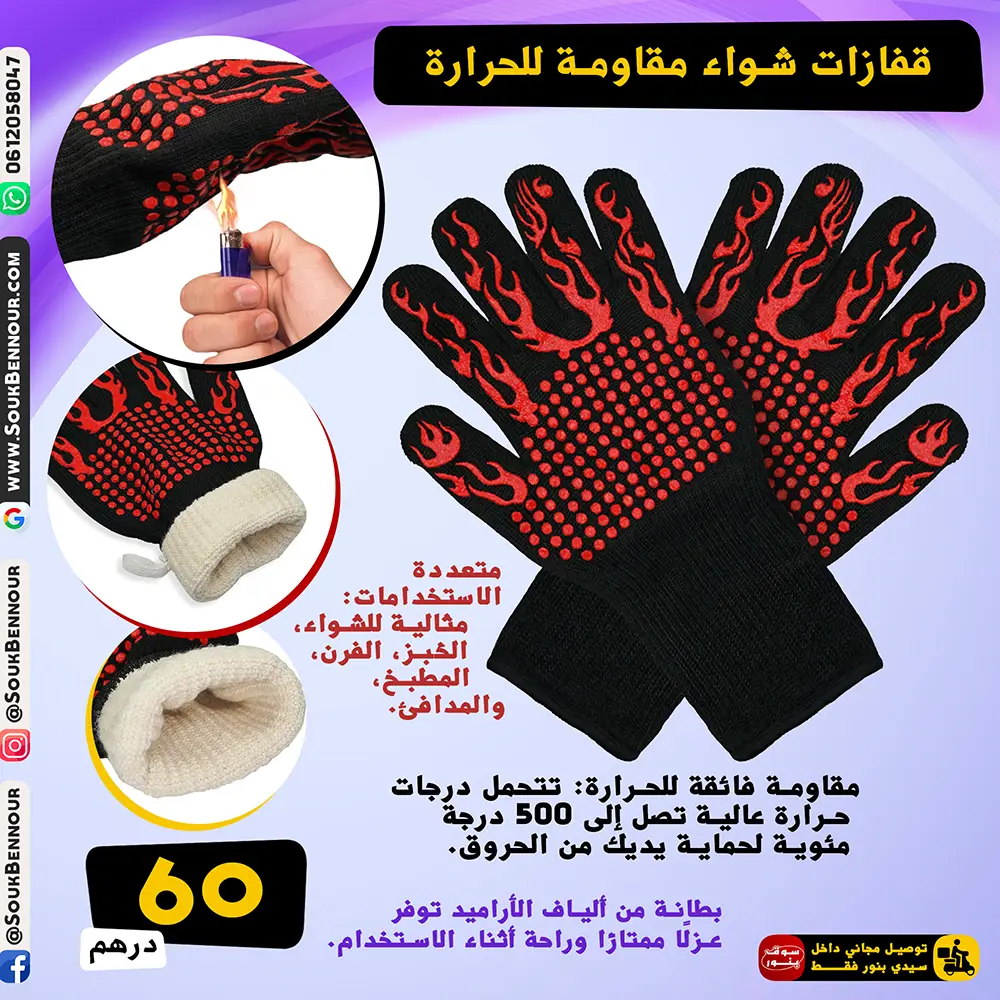 🔥 مقاومة فائقة للحرارة: تتحمل درجات حرارة عالية تصل إلى 500 درجة مئوية لحماية يديك من الحروق.