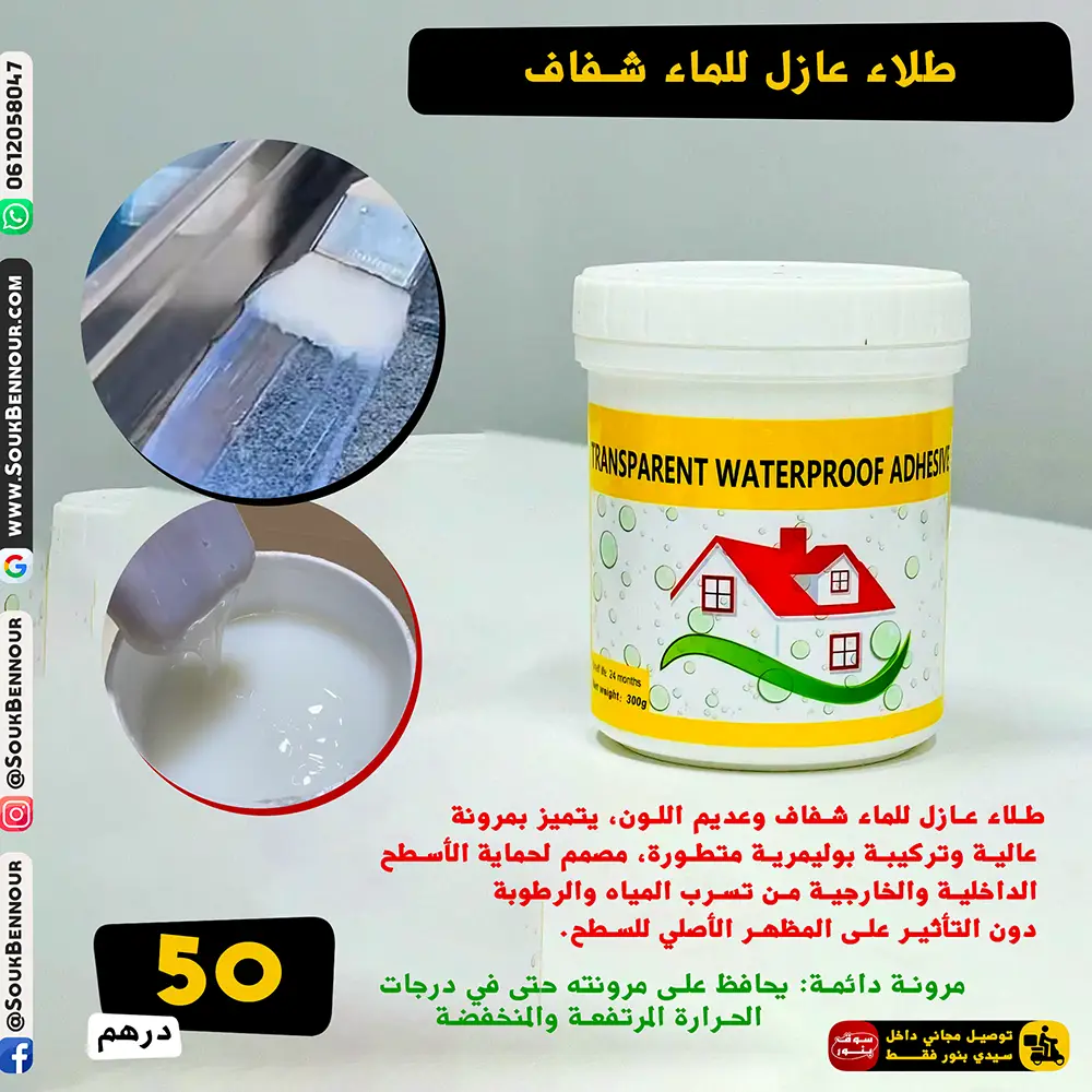 طلاء عازل للماء شفاف وعديم اللون، يتميز بمرونة عالية وتركيبة بوليمرية متطورة، مصمم لحماية الأسطح الداخلية والخارجية من تسرب المياه والرطوبة دون التأثير على المظهر الأصلي للسطح.