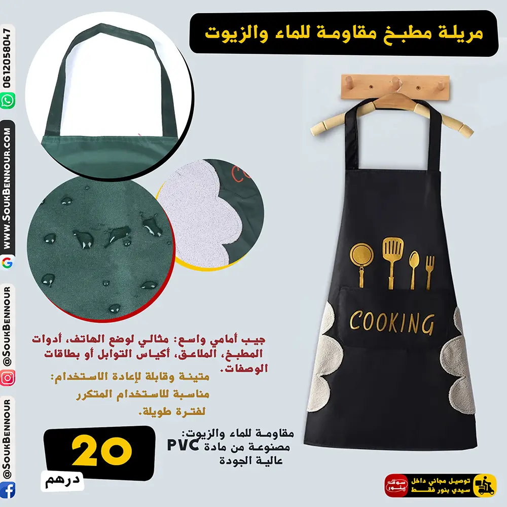 • جيب أمامي واسع: مثالي لوضع الهاتف، أدوات المطبخ، الملاعق، أكياس التوابل أو بطاقات الوصفات.