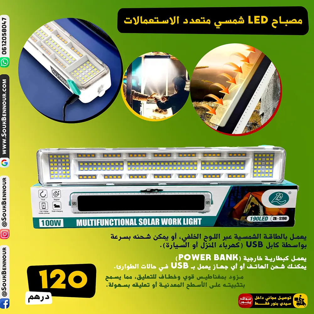 اكتشف الحل المثالي لعدم البقاء في الظلام مرة أخرى. سواء كنت من محبي التخييم، أو تحتاج إلى إضاءة قوية لأعمال الصيانة، أو تبحث عن حل آمن أثناء انقطاع الكهرباء في المنزل، فإن مصباح LED الشمسي متعدد الوظائف بقوة 100 واط هو الخيار الأمثل لك.