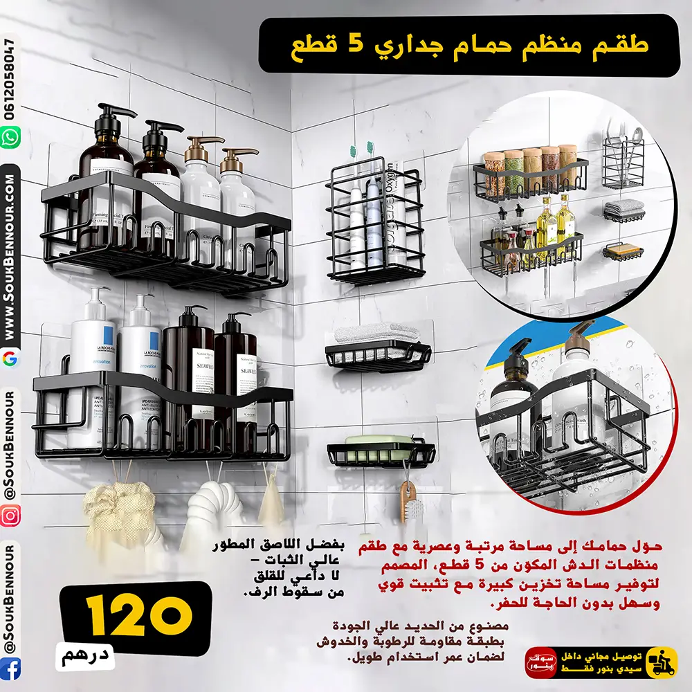 حوّل حمامك إلى مساحة مرتبة وعصرية مع طقم منظمات الدش المكوّن من 5 قطع، المصمم لتوفير مساحة تخزين كبيرة مع تثبيت قوي وسهل بدون الحاجة للحفر.