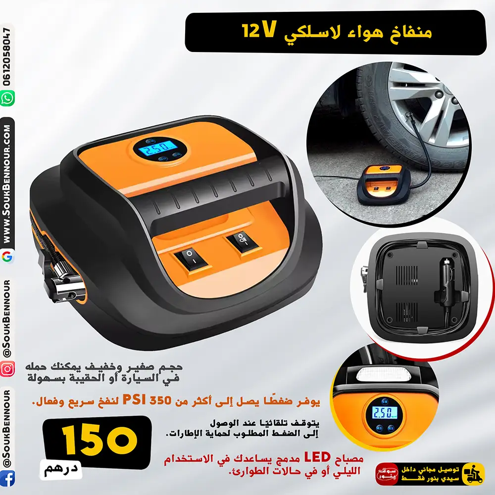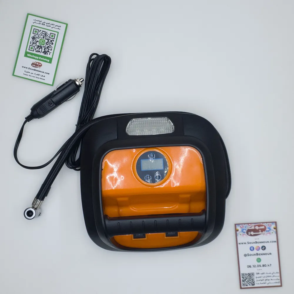 حل مثالي لكل سائق! مع منفاخ الهواء المحمول يمكنك نفخ إطارات سيارتك بسهولة وفي أي وقت دون الحاجة لمحطة الوقود. يتميز بتصميم عملي، شاشة رقمية، وإضاءة للطوارئ، مما يجعله أداة ضرورية داخل كل سيارة.