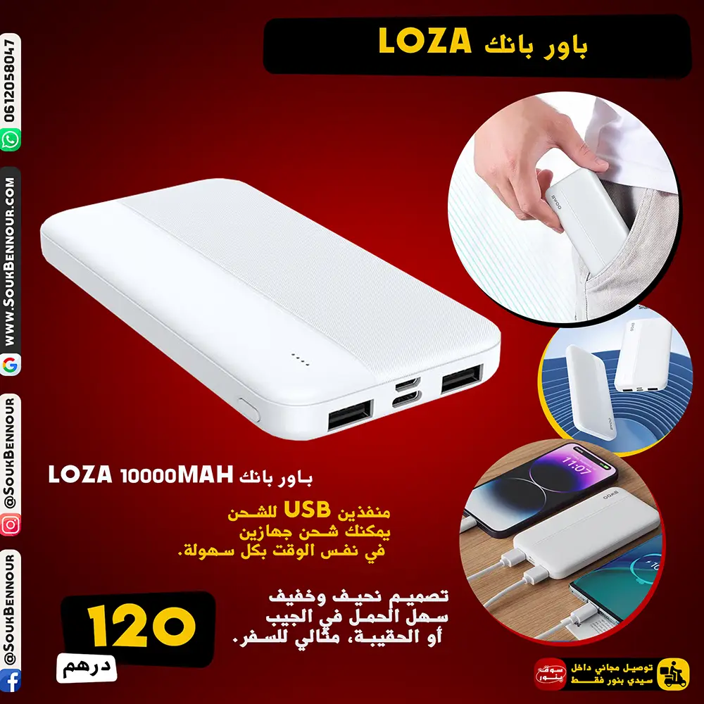 🔋 باور بانك LOZA 10000mAh – تصميم نحيف وشحن مزدوج عملي
